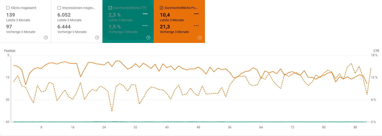 Mit einer klaren SEO-Strategie und neuen, individuellen Leistungs-Landingpages haben wir der Ästhetik Filmproduktion zu neuer Sichtbarkeit verholfen. Die durchschnittliche Position auf Google (Orange) hat sich um mehr als 100% verbessert – mit weiterhin steigender Tendenz auf mehreren Schlüsselbegriffen.